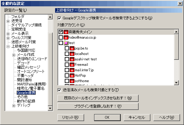 秀丸メールのVersion4.15(旧鶴亀メールの時のバージョン)から、Googleデスクトップ検索に対応しました。サイトー企画で開発したGoogleデスクトップ検索用の秀丸メールデータ用プラグインが用意されていて、それを使うことにより、秀丸メール用のメールデータをGoogleデスクトップ検索にインデックス化させることができます。